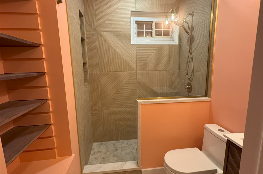 This bathroom renovation transformed a small space into a vibrant and functional design. The remodel features a walk-in shower with geometric tile patterns, custom shelving for storage, and bold coral walls that bring warmth and personality to the room. The combination of unique flooring and modern fixtures created a bathroom that feels stylish and inviting.